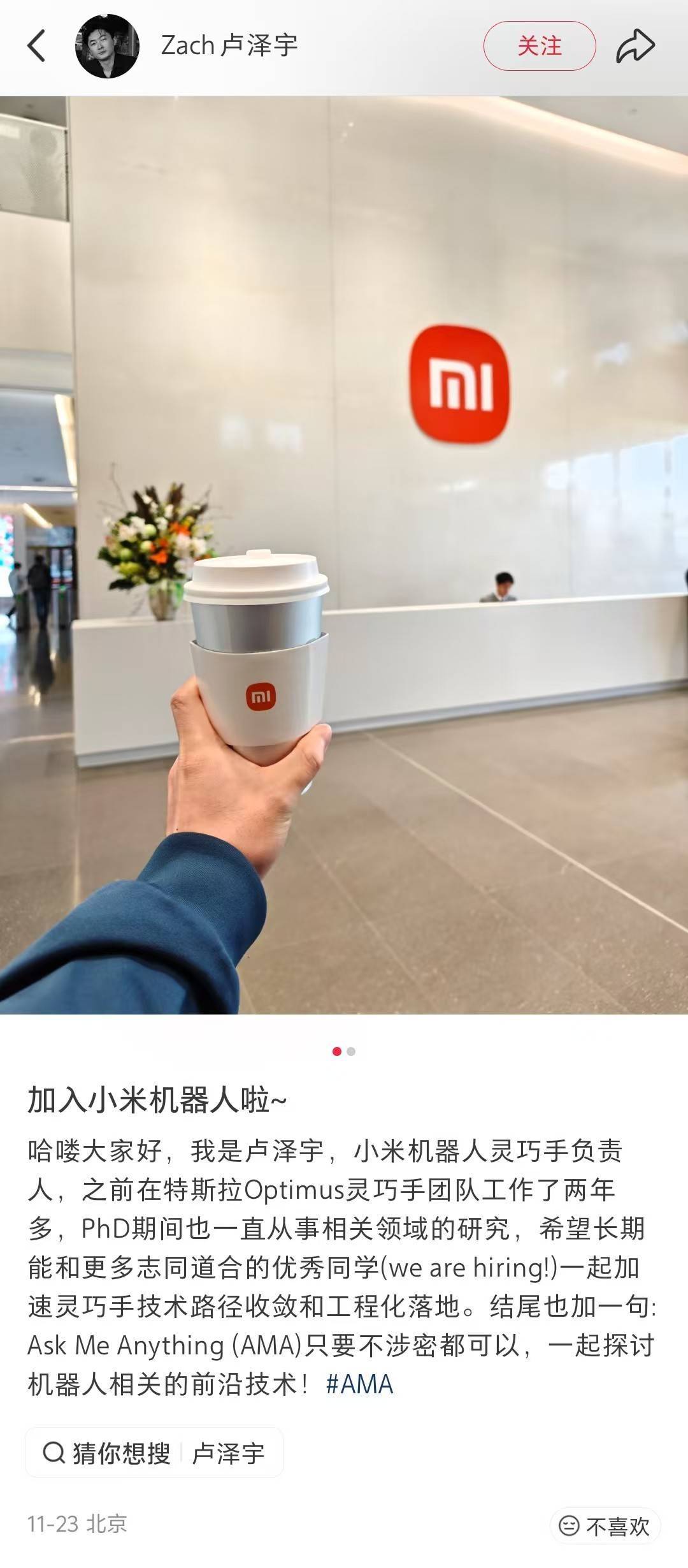 凤凰网科技讯 11月26日,前特斯拉Optimus奢睿手团队成员卢泽宇已加入小米机器东说念主团队,谨慎奢睿手。他在个东说念主酬酢平台上暗示,但愿能和更多志同说念合的优秀同学悉数加快奢睿手技能旅途经管和工程化落地。