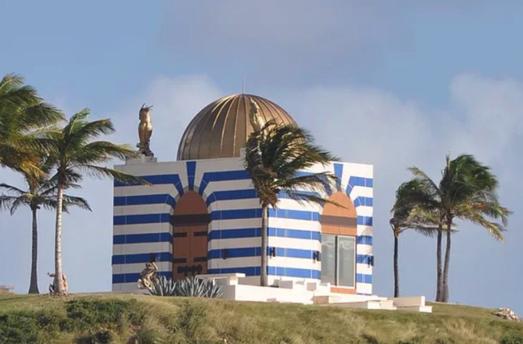 在一众开采里,最引东谈主细心标是一座高大的日晷,东谈主不错走在上头,两头各插着一面好意思国国旗。在日晷的另一端,有一座蓝白条纹、带有金色穹顶和屋顶雕像的方形开采。这座开采曾激发诸多预计,有东谈主说它是地下密室的进口,还有东谈主认为它是爱泼斯坦用来进行奥秘典礼的场合。