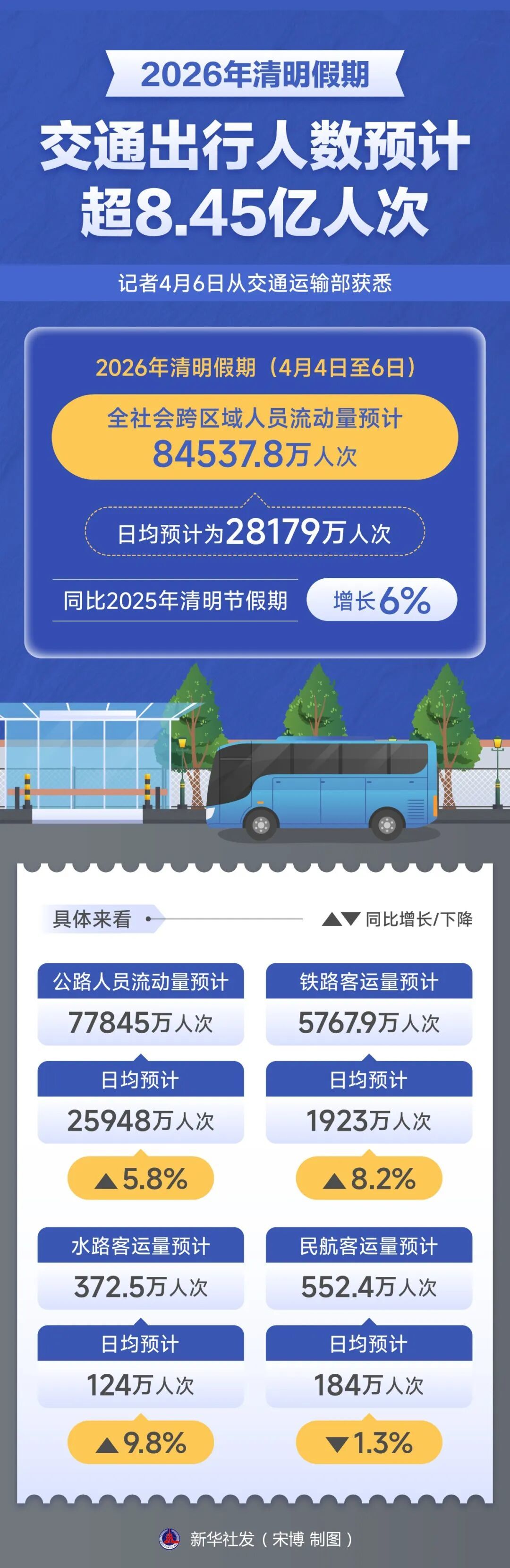 交通运输部讯息,本年明朗假期(4月4日至6日),全社会跨区域东谈主员流动量瞻望为84537.8万东谈主次,日均瞻望为28179万东谈主次,同比2025年明朗节假期增长6%。