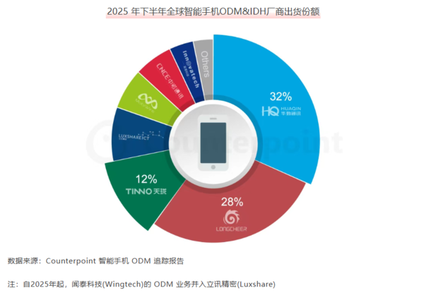从市集份额来看,2025年下半年,华勤以32%的市集份位居首位,龙旗紧随后来,占比28%,天珑则以12%的市集份额位列第三。