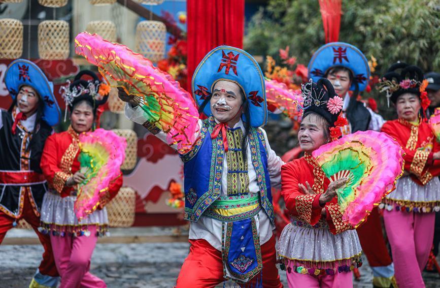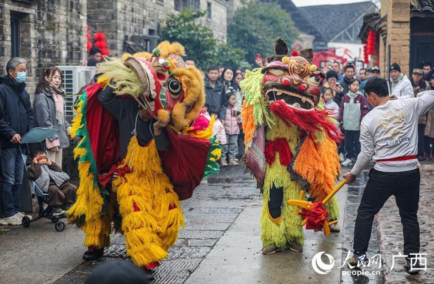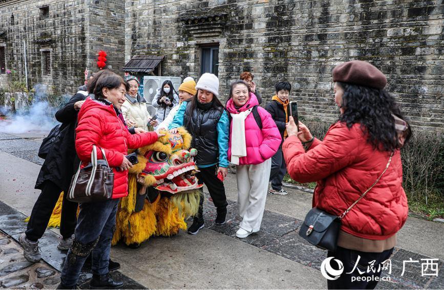 演员们正在进行走牌灯饰演。阳海翔摄春节时间体育游戏app平台,在广西桂林市灵川县大圩镇东漓古村景区,搭客们不雅赏走牌灯、彩调等非百姓风,回味灵川秉性好意思食,感受浓浓年味。(陈燕、阳海翔)