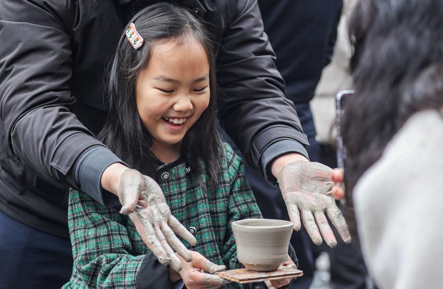 小一又友和家东说念主在跟作念好的陶艺拍照。阳海翔摄